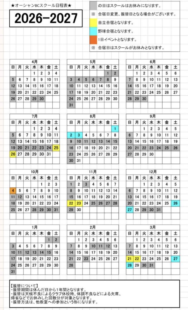 スクール年間カレンダー/OCEAN規約 ※スクール予定はこちらをご確認ください。 黒く塗られている部分はお休みとなりますので、ご確認の上、練習にご参加ください。 2025~2026 2026~2027 Screenshot スクール規約 OCEAN既約 クラブにご入会されている方は、こちらのスクール規約を必ずご覧ください。 規約が変更される場合は、トップページや配信にてご連絡させて頂きます。